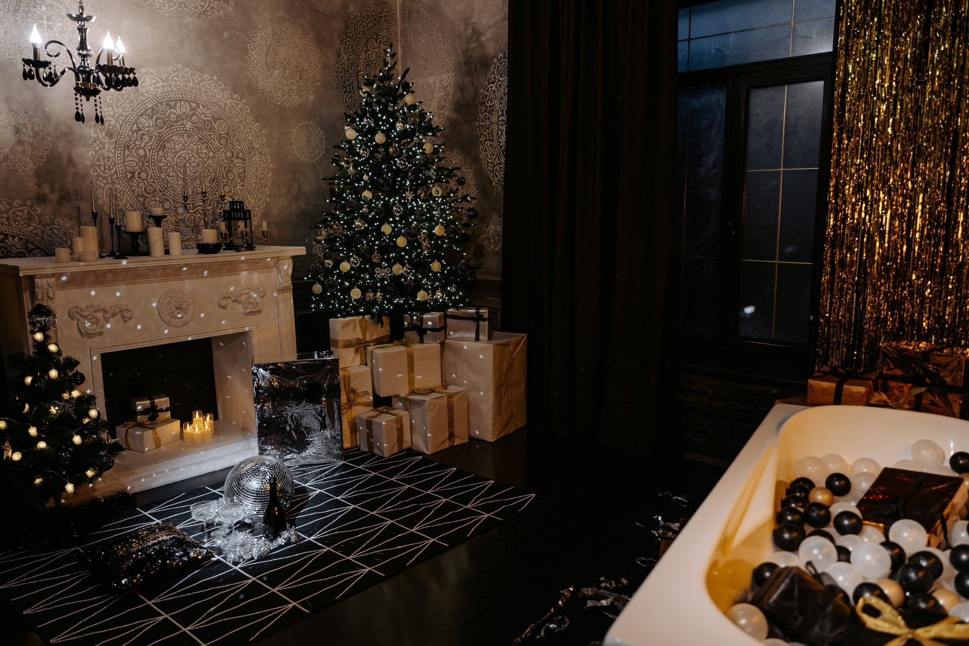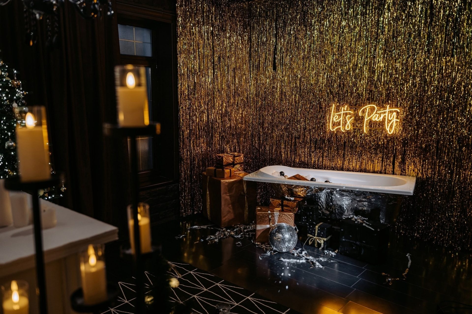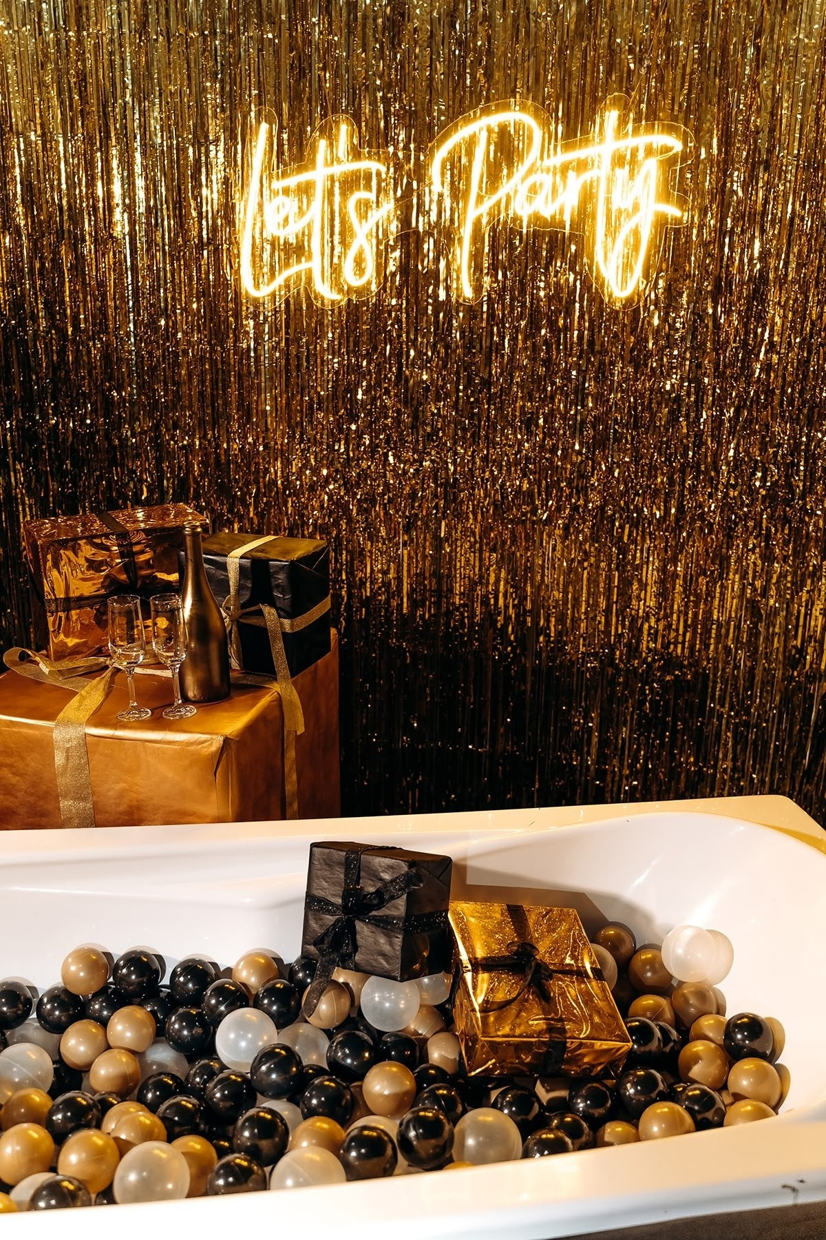 Ванна, в которую можно улечься) Шарики, которые можно раскидывать! Чёрная ёлка с диско-шарами и бокальчики для игристого, которые поддерживают атмосферу праздничной вечеринки! Блестки, пайетки, каблуки, яркая помада и улыбки — все это прямо просится в кадр!