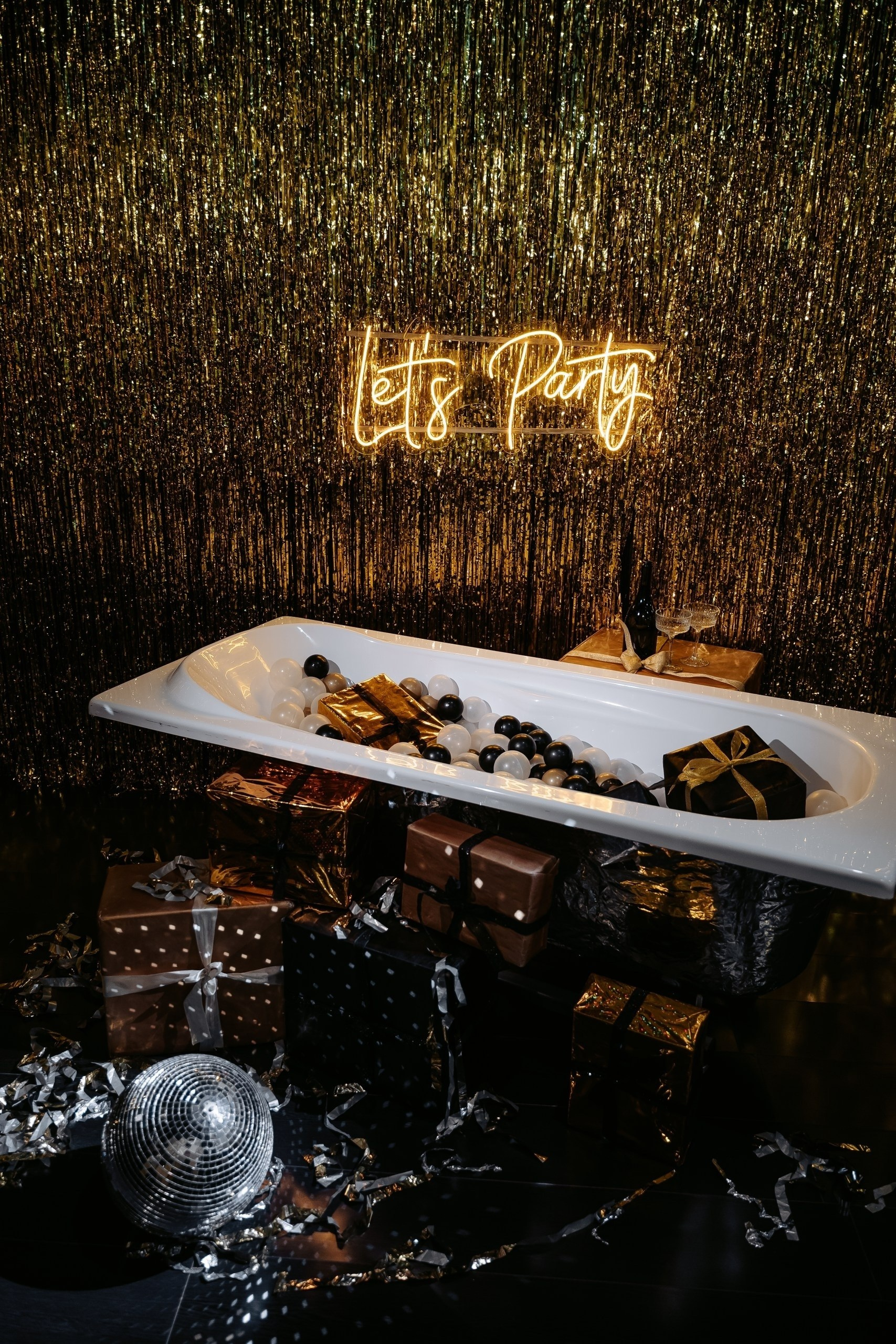 Также можно установить ванну с подарками под надписью «Let's party»)