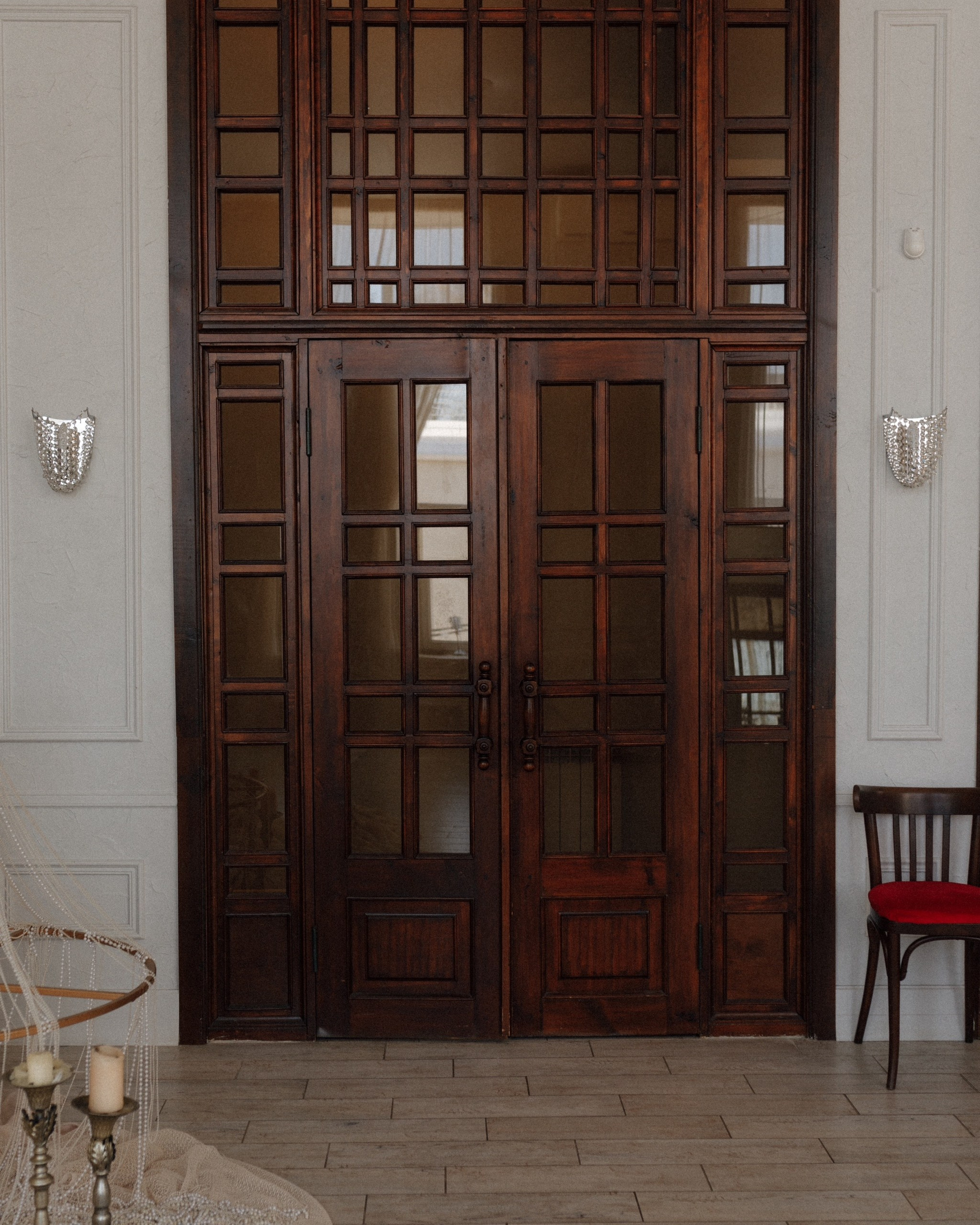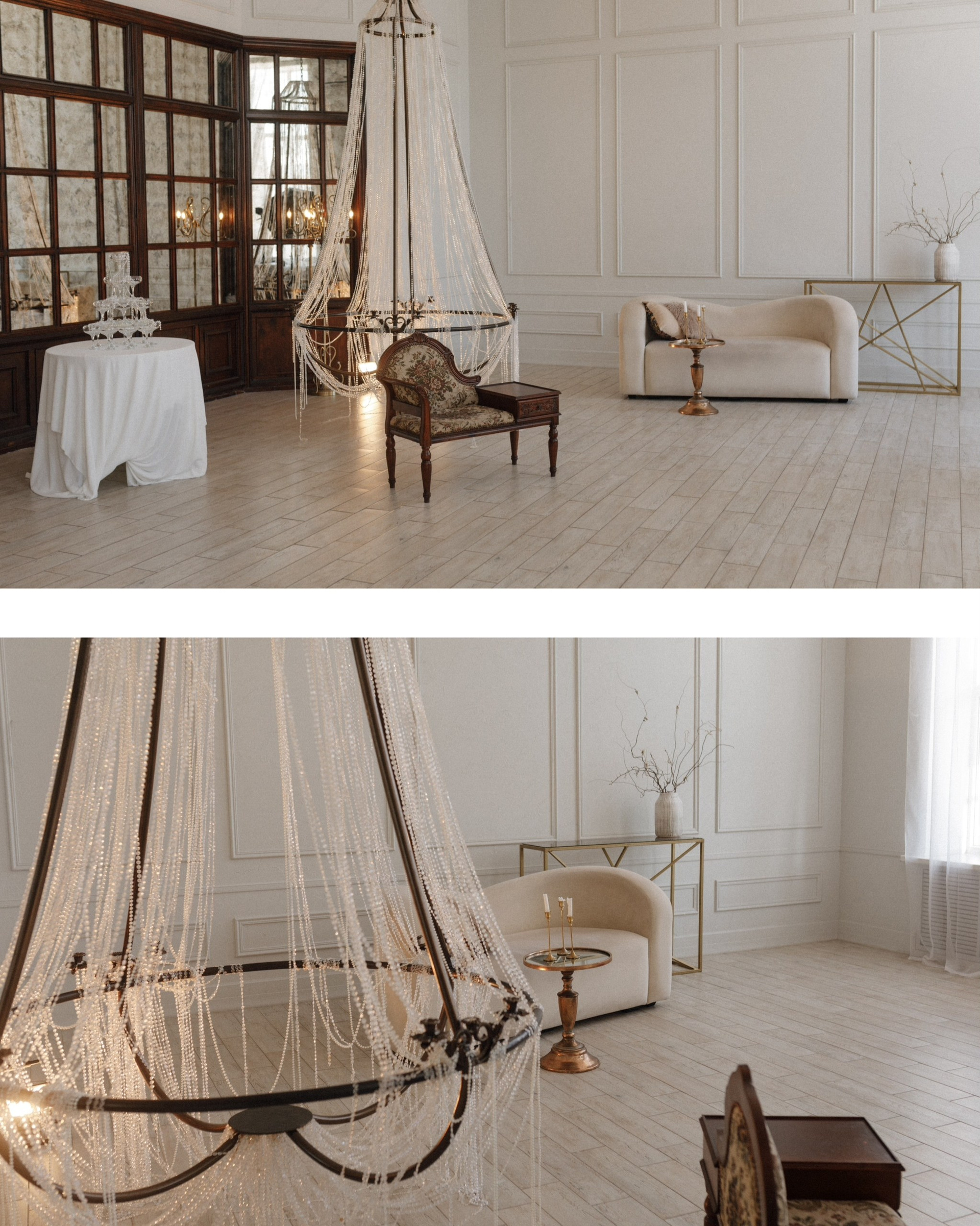 Зал с легендарной роскошной люстрой от потолка до пола… И самое интересное — на ней можно качаться, сидеть, стоять!))) В зале — тепло и много пространства) Сейчас здесь — очень стильные нейтральные оттенки преобладают во всём) Глаз радуется!