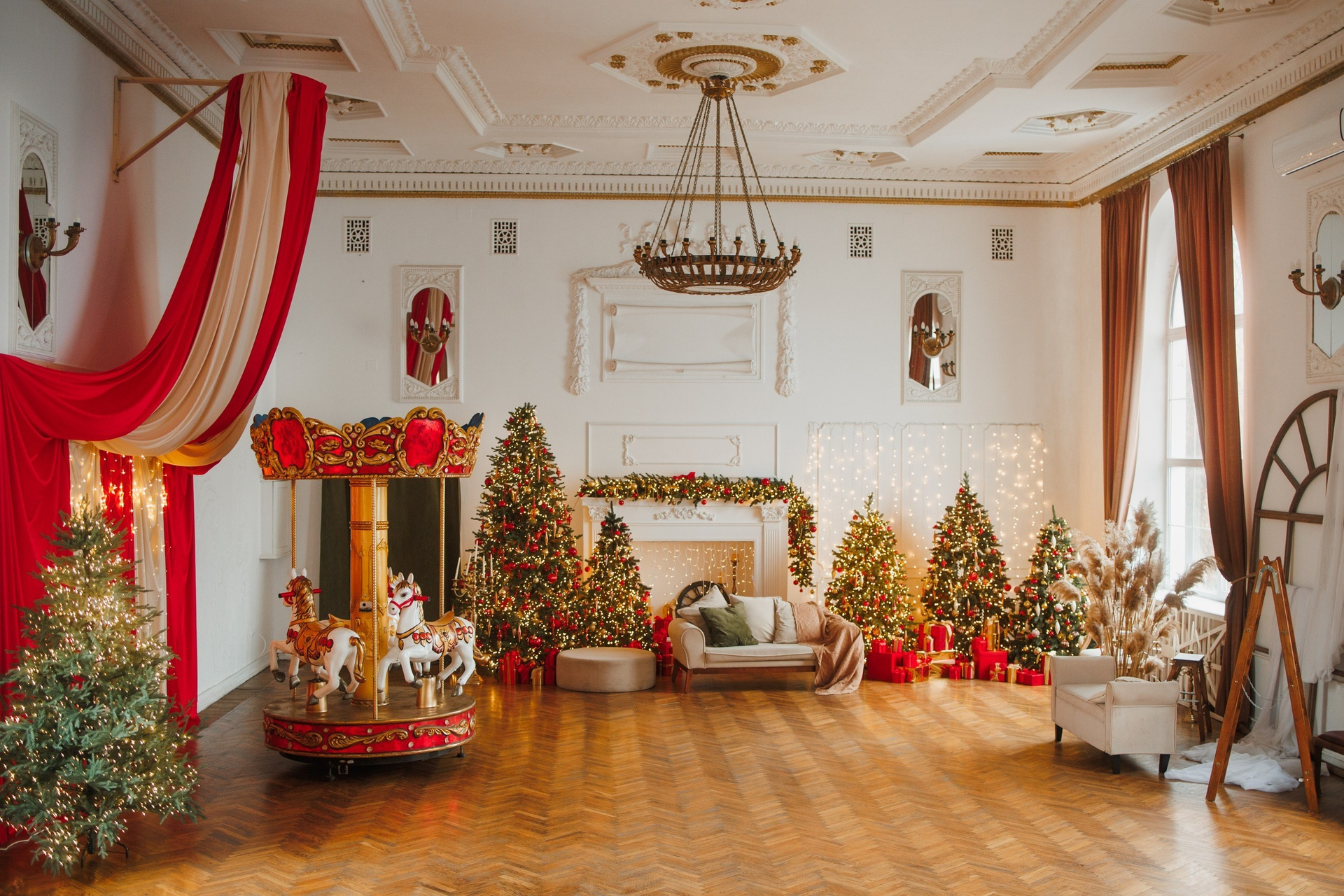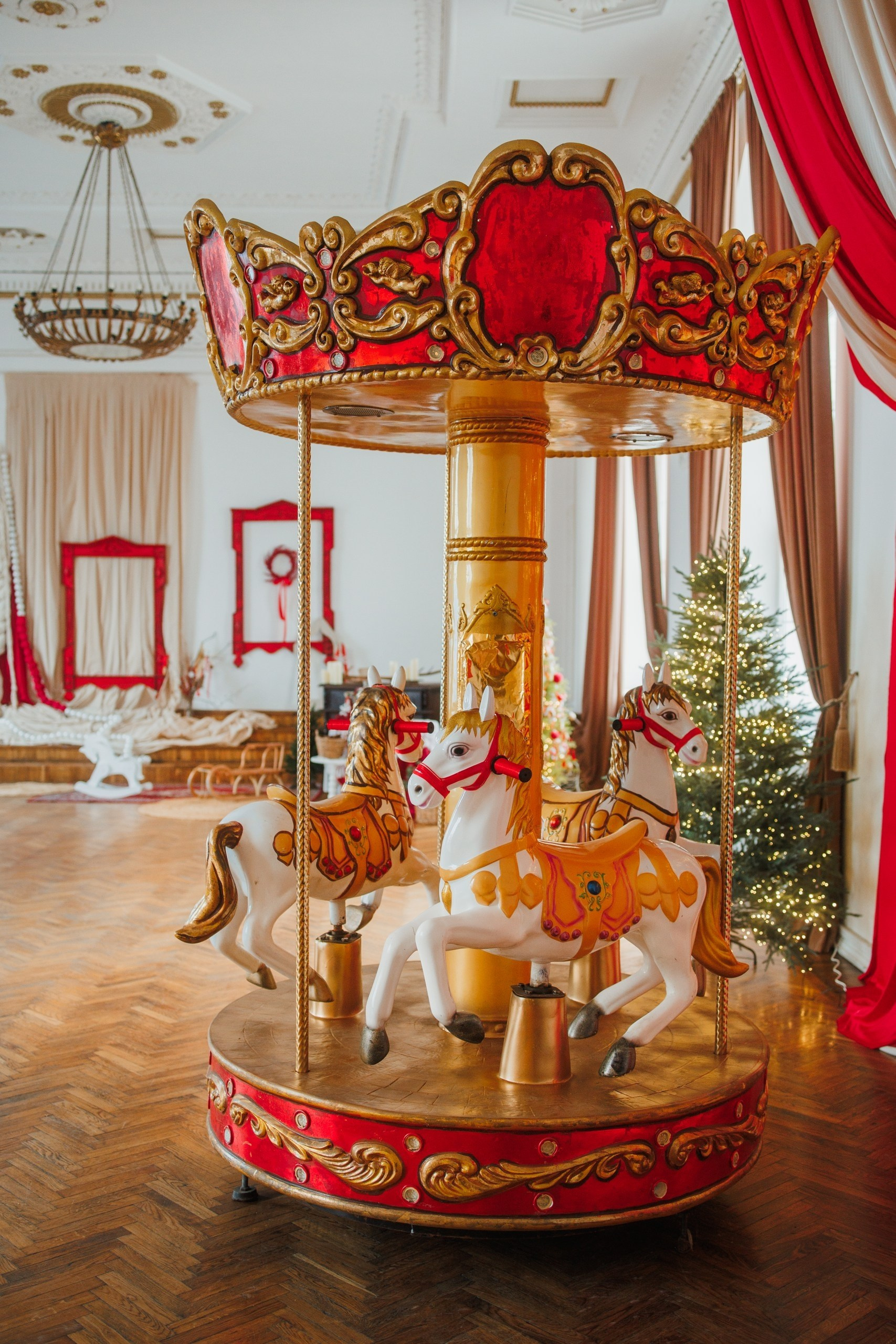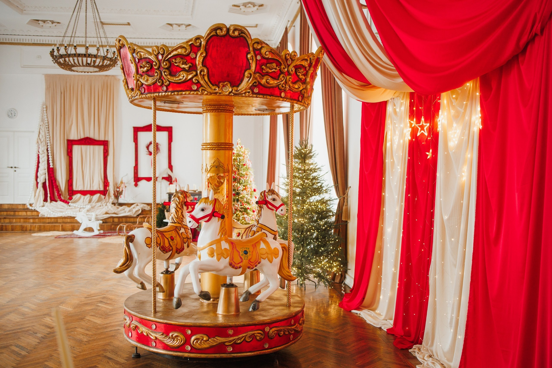 Сверкающий, шикарный Новый год ждёт вас! Целых 140 кв м красоты! 2 роскошные новогодние фотозоны, уникальная карусель, яркие оттенки и нейтральная (неновогодняя фотозона) — всё это в одном зале!