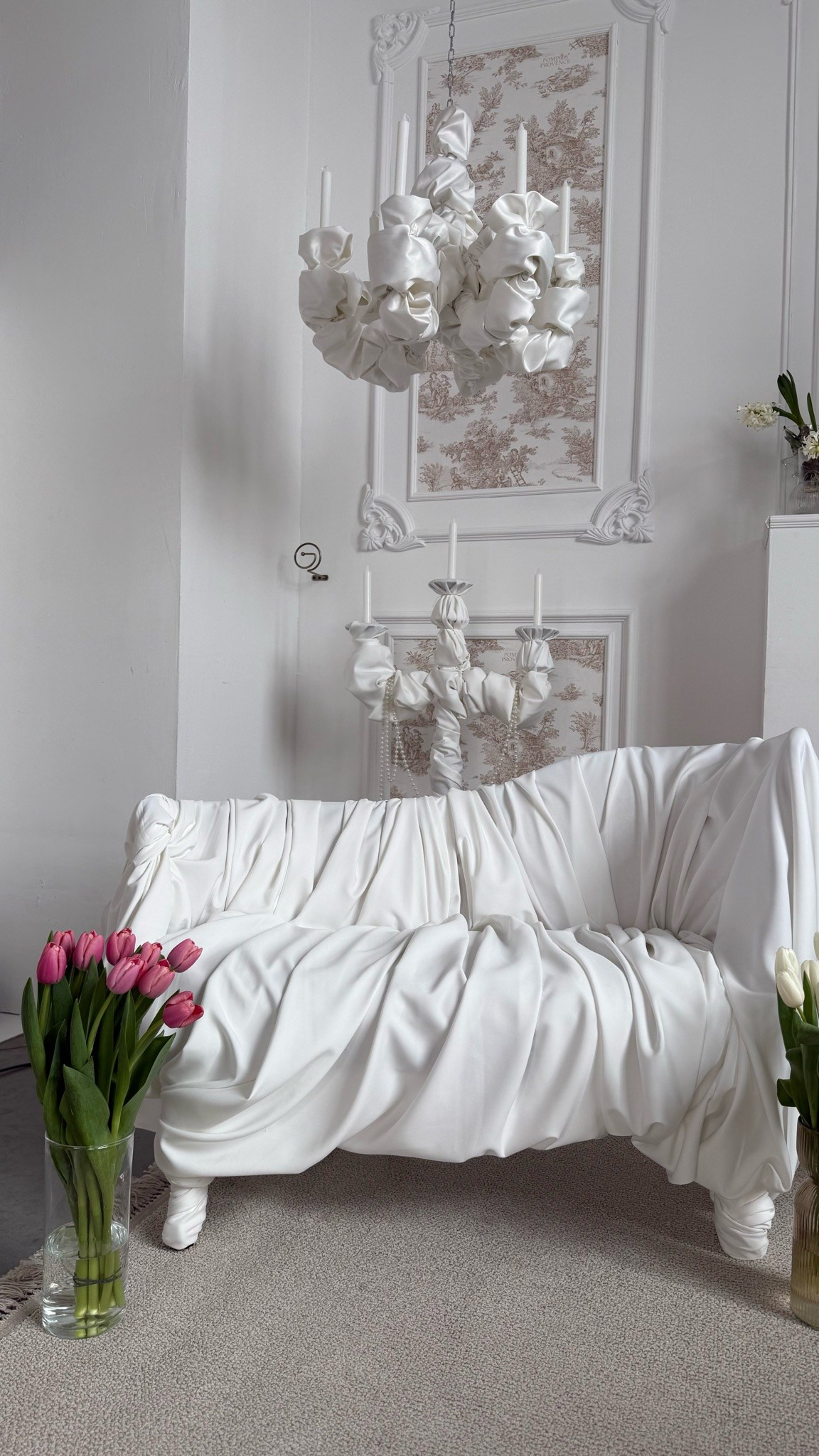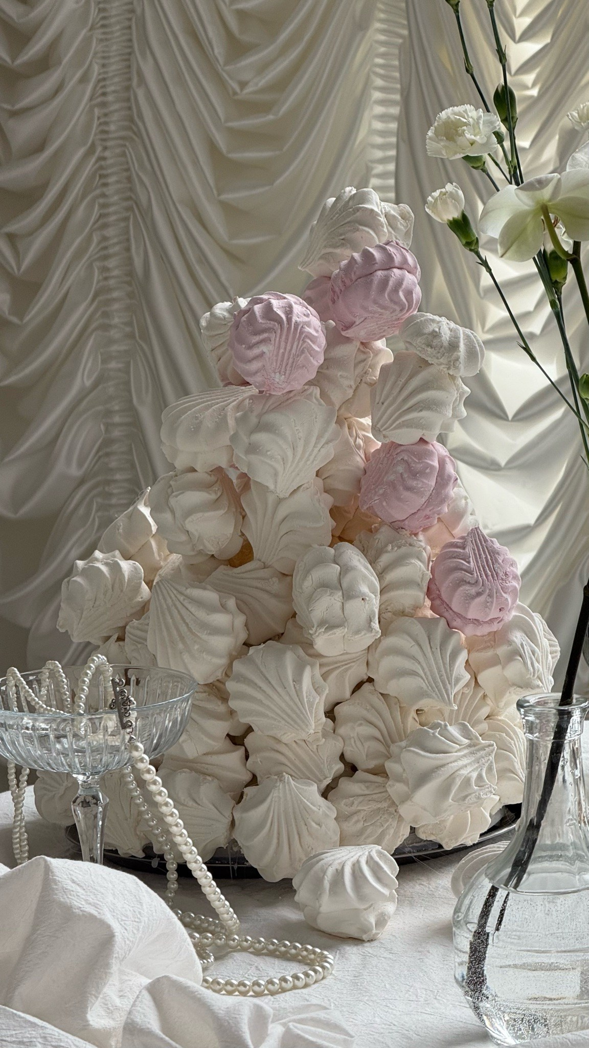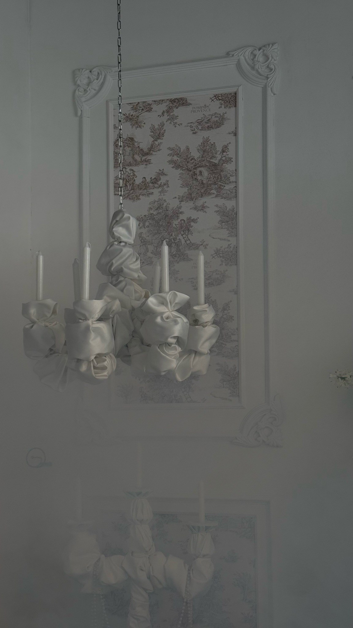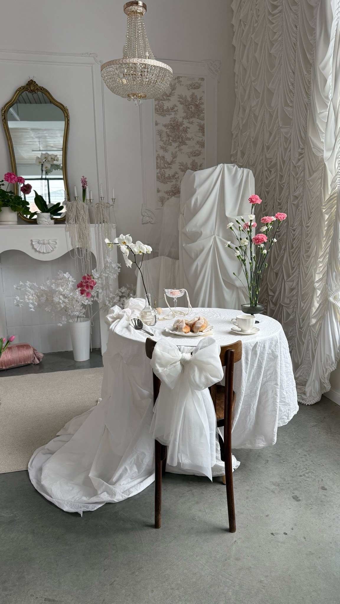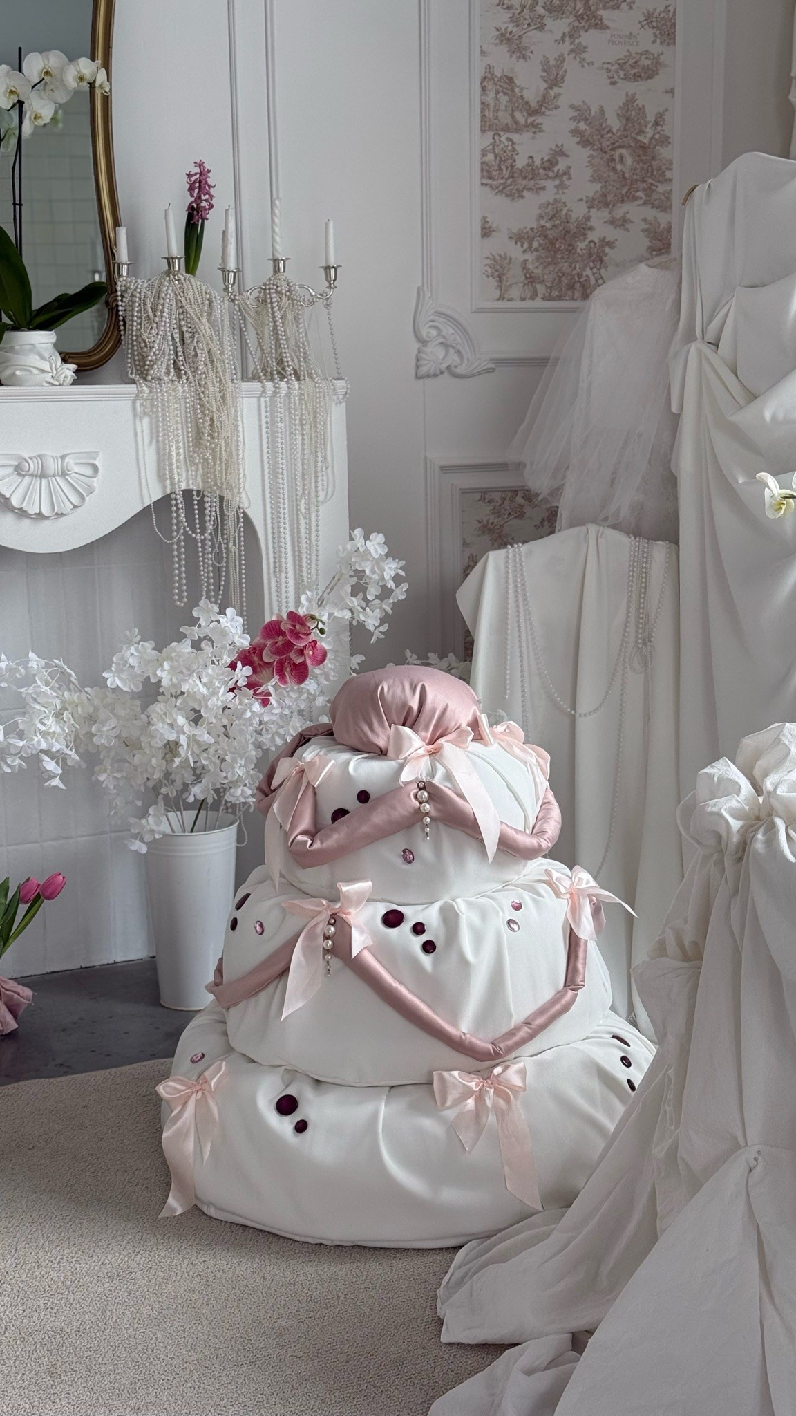 Ткани, драпировки, необычайной красоты торт из тканей, кружево и подушки, люстры и свечи, стол и цветы, красивая посуда и серебро, красивый свет из окна и театральные шторы