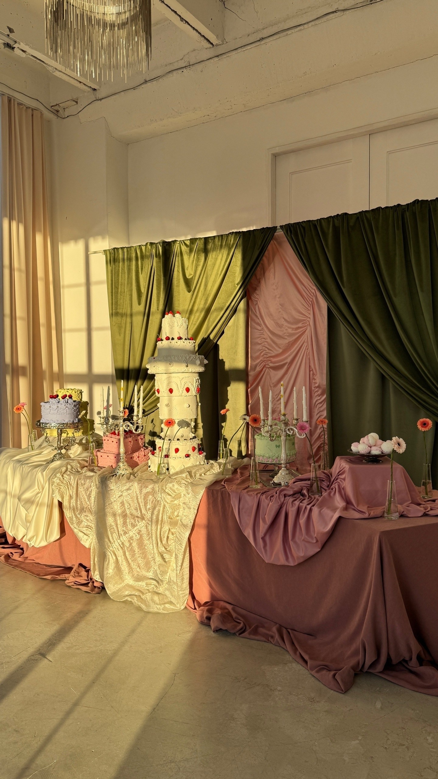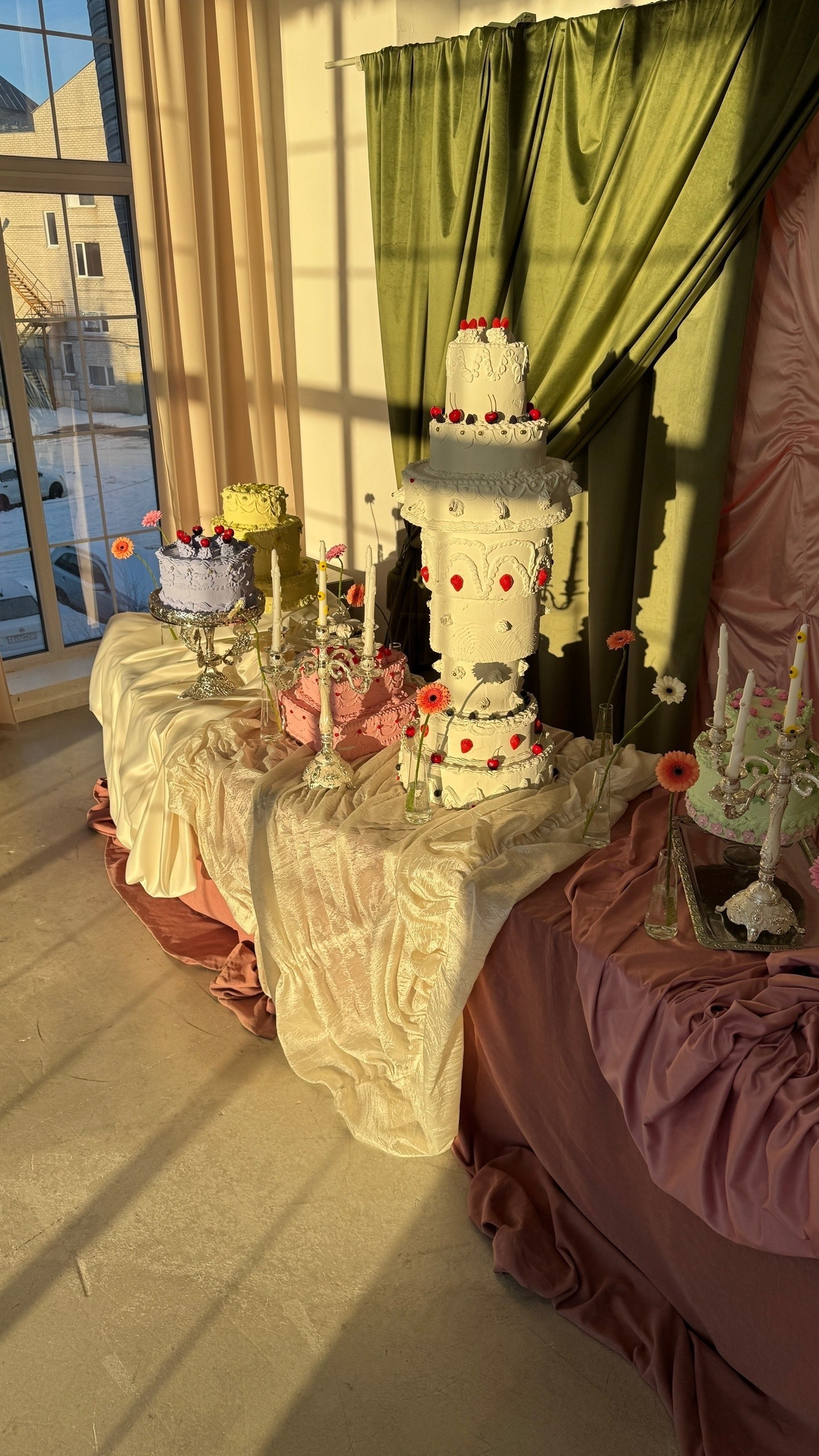 Уютный, просторный зал с интересной фотозоной — чудесные тортики ждут вас!)